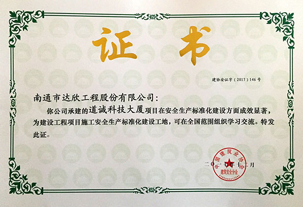 近幾年,我公司獲得全國AAA級安全文明標準化工地25項,創(chuàng)建面涉及上海、江蘇、河北、黑龍江、湖南、新疆等市場,榮譽的取得為進一步提升“達欣”在全國各個市場的影響力,促進企業(yè)健康發(fā)展奠定堅實的品牌基礎(chǔ)。