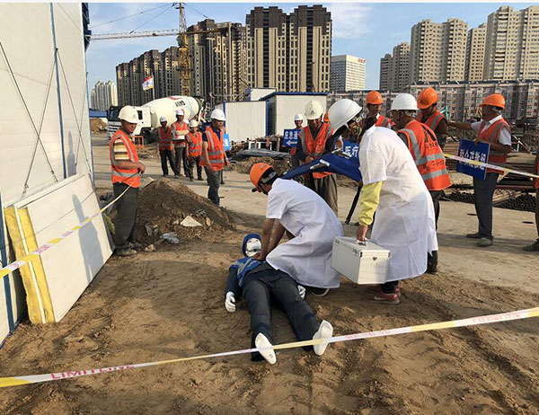 此次應(yīng)急救援預(yù)案演練模擬施工工人從高處墜落?!耙馔狻卑l(fā)生后,現(xiàn)場負(fù)責(zé)人立即組織人員撤出危險(xiǎn)區(qū),并在匯報(bào)情況后聽從指示在第一時(shí)間啟動(dòng)應(yīng)急預(yù)案。在應(yīng)急總指揮的指令下,救援小組迅速就位,并有序展開警戒護(hù)衛(wèi)、技術(shù)排險(xiǎn)、現(xiàn)場搶險(xiǎn)、醫(yī)療救護(hù)等各項(xiàng)救援工作,使險(xiǎn)情得到有效控制,隨后,傷員被送往醫(yī)院進(jìn)行救治。
