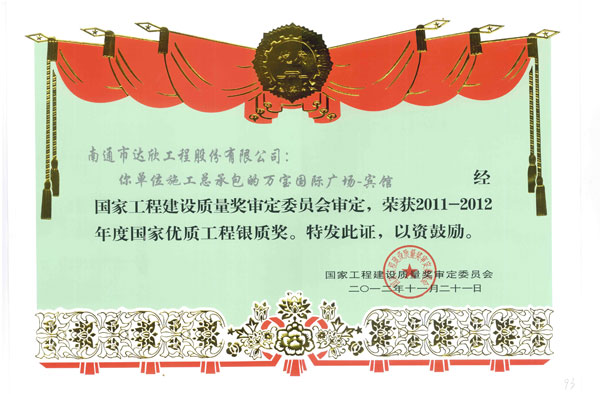 我公司總承包施工的上?!叭f寶國際廣場-賓館”作為主申報單位,在先后獲得上海市“節(jié)約型”樣板工地、上海市優(yōu)質(zhì)結(jié)構(gòu)工程、上海市“白玉蘭”優(yōu)質(zhì)工程后,經(jīng)上海市建筑施工行業(yè)協(xié)會推薦,經(jīng)國優(yōu)專家組現(xiàn)場檢查,評審委員會評審,最終榮獲了2011-2012年度國家優(yōu)質(zhì)工程銀質(zhì)獎。上海萬寶國際廣場-賓館項目是自公司易名以來,首次以“達欣股份”為主體的總承包申報項目。