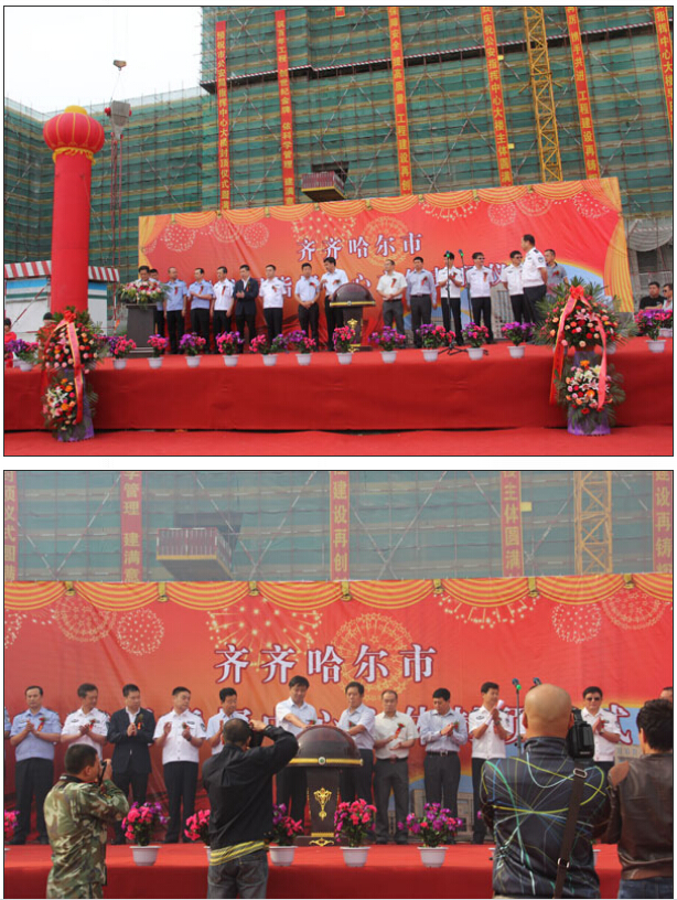 7時58分儀式正式開始。首先由第七工程公司經(jīng)理王建國同志代表公司董事長馬和軍同志作了熱情洋溢的致辭,齊齊哈爾市副市長、市公安局長吳剛宣布封頂儀式正式開始,并和王建國同志共同啟動慶典水晶球,項目建設(shè)各方共同慶賀這一激動的人心時刻。