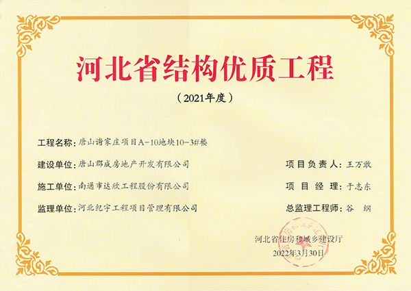 近日,從河北省住房和城鄉(xiāng)建設廳傳來喜訊,集團邊各寨棚戶區(qū)改造項目、唐山謝家莊項目、邯鄲市雞澤縣多館合一等五項目榮獲河北省結(jié)構(gòu)優(yōu)質(zhì)工程。
