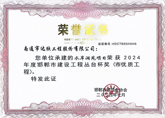 日前,從邯鄲市建筑業(yè)協(xié)會獲悉,水岸瀾苑項目獲邯鄲市2024年度優(yōu)質工程---“叢臺杯”工程。
