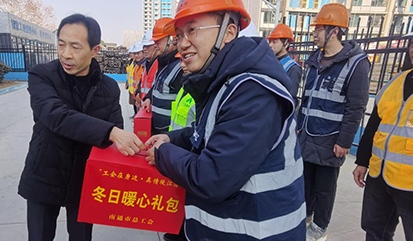 1月13日,南通市總工會黨組成員、經審會主任周正秋,南通市總工會權益保障部部長趙周恒一行,來到達欣集團南通R23005地塊項目建設現場,開展“工會在身邊 真情暖江海”2025年春節(jié)送溫暖活動,為奮戰(zhàn)在一線的工作人員送上冬日暖心禮包和新春的祝福與慰問。