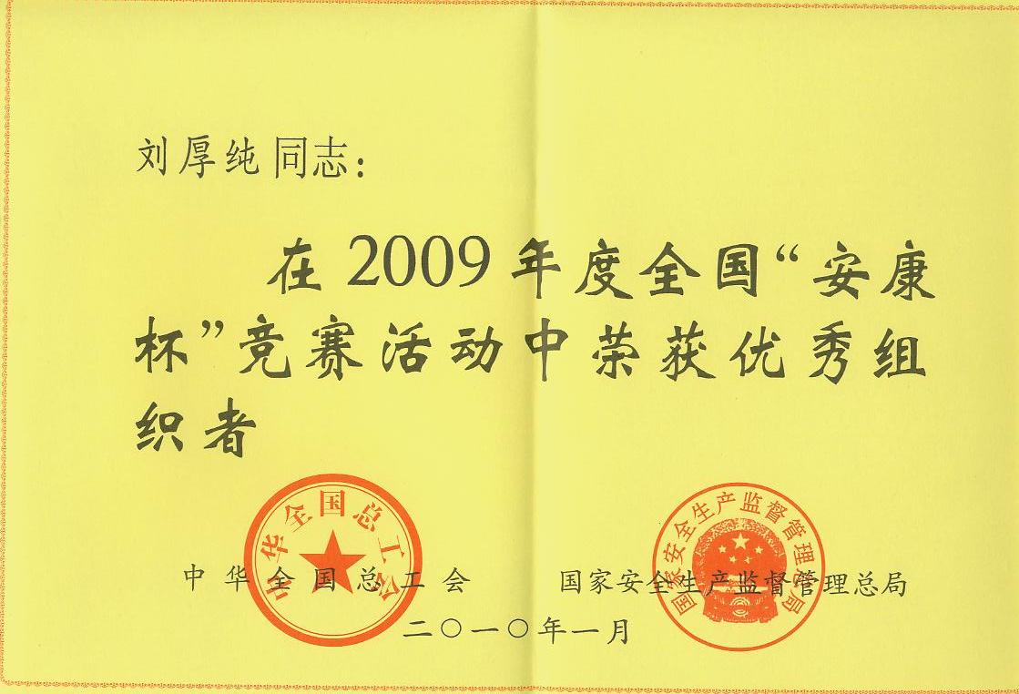 中華全國(guó)總工會(huì)、國(guó)家安全生產(chǎn)監(jiān)督管理總局聯(lián)合發(fā)文,公司黨委書記、副董事長(zhǎng)劉厚純獲得2009年度全國(guó)“安康杯”競(jìng)賽活動(dòng)優(yōu)秀組織者稱號(hào)。