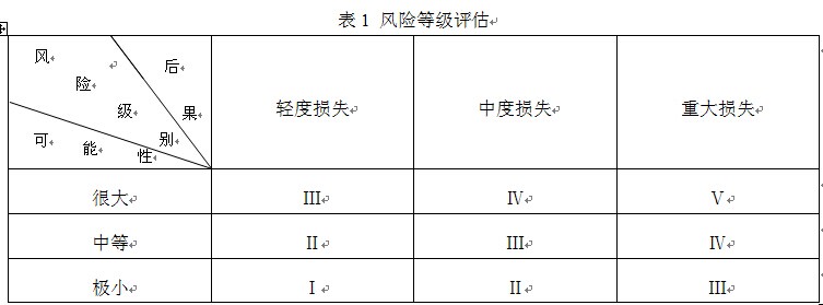 在對危險源識別的基礎(chǔ)上,評估危險源造成風險可能性和大小,對風險進行分級,對不同等級風險采用相應(yīng)的風險控制措施。風險等級評估:Ⅰ級為可忽略風險;Ⅱ級為可接受風險;Ⅲ級為中度風險;Ⅳ級為重大風險;Ⅴ級為不容許風險,如表1。