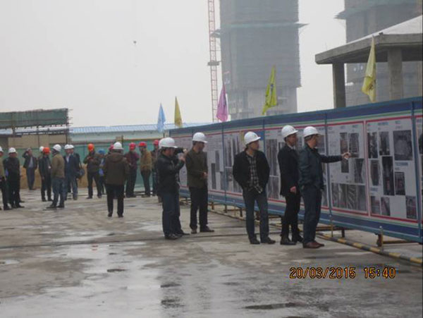 施工現(xiàn)場,項目經(jīng)理崔益明就工程概況、文明工地創(chuàng)建采取的措施、質(zhì)量管理方面新工藝、新材料革新以及采用樣板引路所取得的成效向來訪嘉賓作了詳細介紹。考察嘉賓們一行先后參觀了11#、12#地塊現(xiàn)場文明施工、樣板展示區(qū)、結(jié)構(gòu)實體工程,對該項目部施工生產(chǎn)、安全質(zhì)量、現(xiàn)場文明等方面給予了高度評價。蘇州新湖置業(yè)王總表示希望在蘇州區(qū)域保持良好持久合作的基礎(chǔ)上,將積極推薦我司參與新湖中寶其他區(qū)域公司的項目合作。