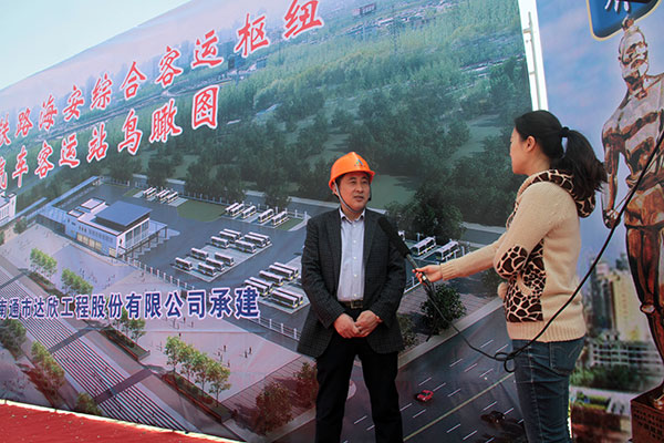 在開工儀式后,馬董事長現(xiàn)場接受了海安電視臺的采訪,代表公司向全縣人民承諾,要把本項目作為公司的重點工程、形象工程展示給全縣人民,做到抓質量精益求精,抓進度一絲不茍,抓安全防微杜漸,以一流的素質,一流的服務,一流的技術,打造出優(yōu)質的精品工程回饋家鄉(xiāng)人民。